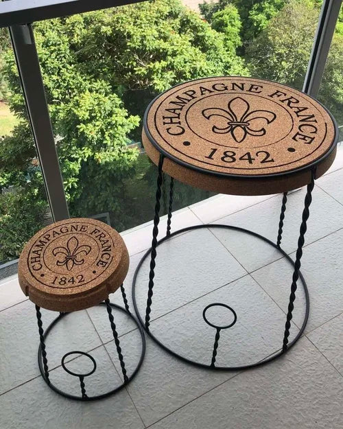 FARO- Champagne cork stool with wrought iron legs. 74cm high and top is 30cm in diameter. $475