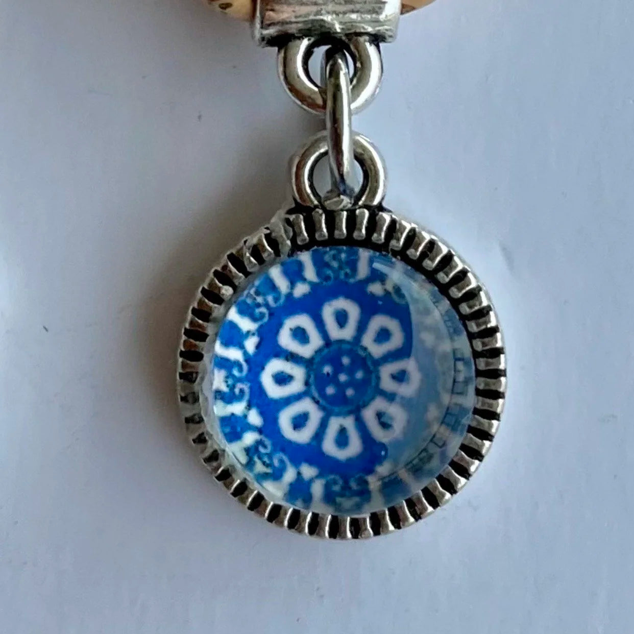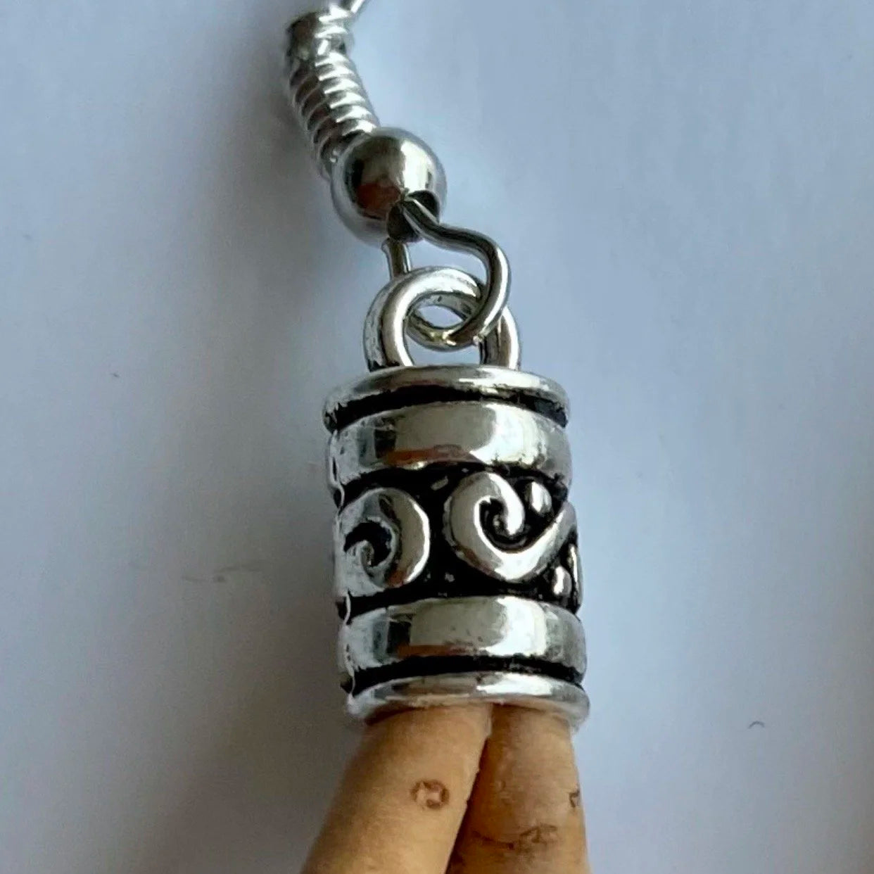 Gorgeous cork drop earrings with silver feature and blue stone.