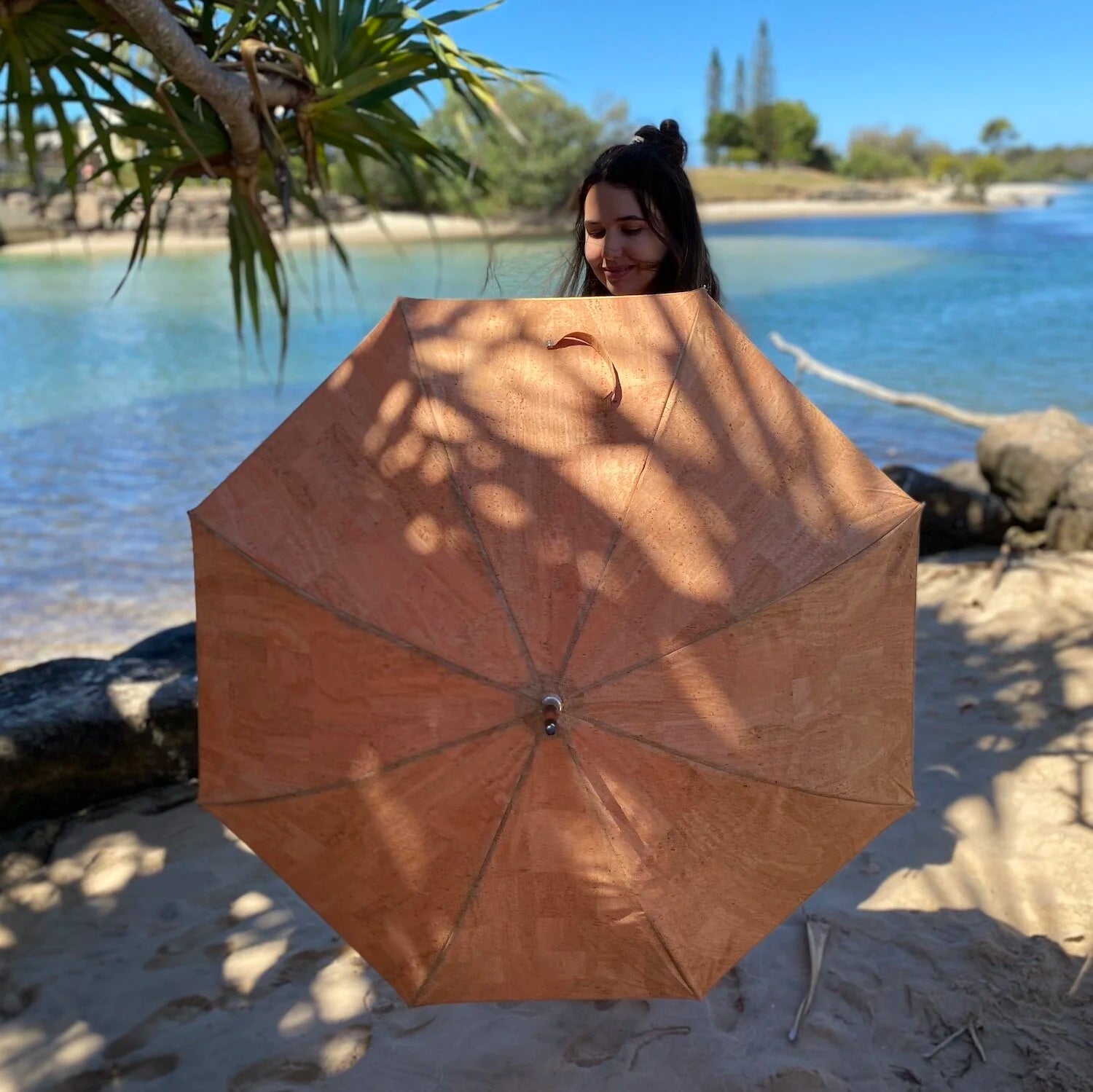 This is unique- a cork umbrella!. It has a beautifully crafted wooden handle, a strong metal frame and UV blockout lining. Cork makes the ideal umbrella as it is waterproof. This umbrella is made in Portugal from high quality cork. Two colours to choose from: A- red lining and B-natural lining.